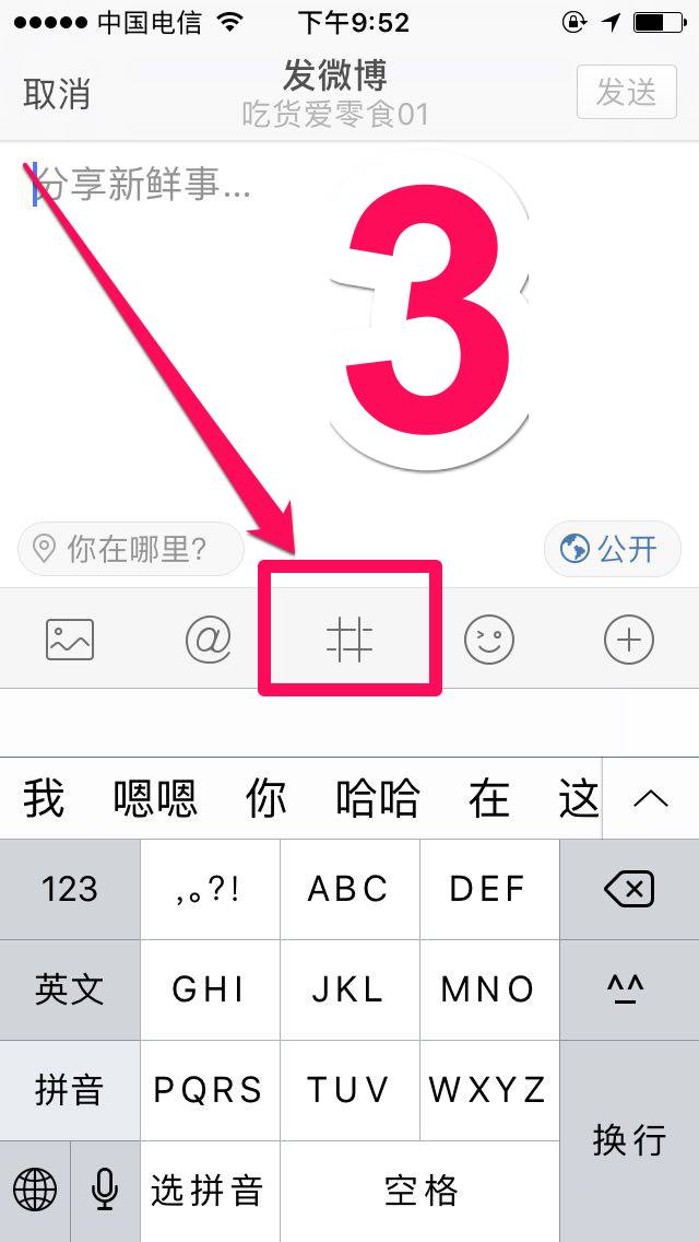 第三步,点击#插入你想插入的话题,这里可以自己搜索热门话题,也可以自己编辑话题